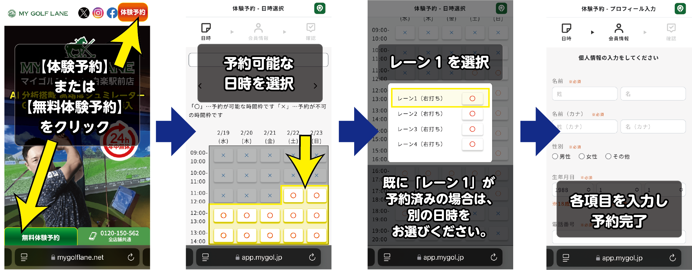 既に「レーン1」に予約が入っている時間帯では体験予約を受け付けることができません。後ほど日時の変更をお願いすることになりますので、予めご了承ください。